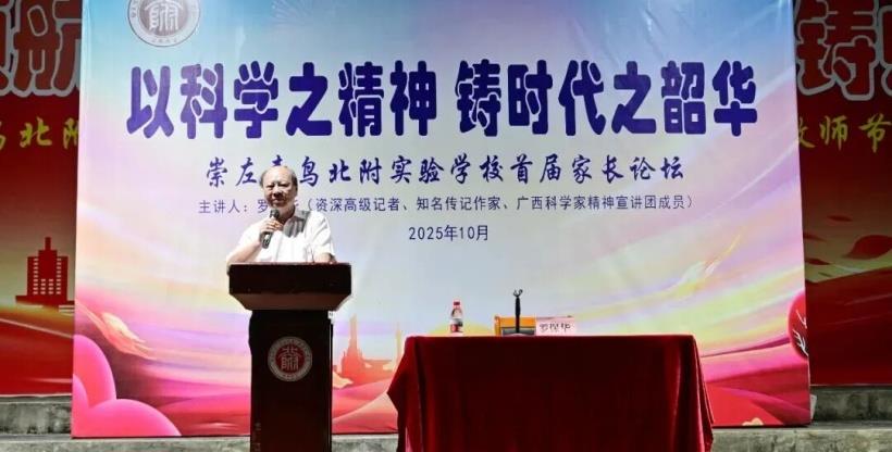 10月11日,“以科学之精神,铸时代之韶华——郑建宣、郑志鹏、郑阳恒三代物理学家的信仰与奋斗”主题宣讲会在崇左青鸟北附实验学校举行。